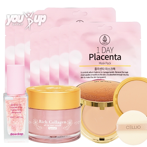 | 内容量 | [ゴールドかたつむりEXパウダーファンデセット]本体15g+詰め替え用15g [3DリフティングスレッドショットEX美容液]50ml [プラセンタMAXモイストパック]1枚×10 [リッチ生コラーゲンオールインワンクリーム(スペシャル)]50ml |