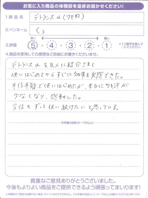デトランスαを友人に紹介されて使いはじめてからすぐに効果を実感できた。半信半疑で使いはじめたが、本当にワキ汗が少なくなり、感動した。今後もずっと使い続けたいと思っている。