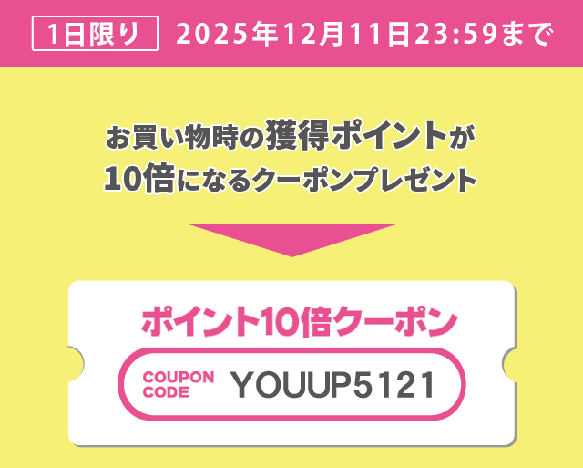 全商品が対象!期間内なら何回でもご利用が可能です! お買い物時にもらえるポイントが『10倍』になる、お得なイベントを実施中です! 期間限定ですので、ご購入を検討中の方はこの機会に、是非ゲットしましょう!