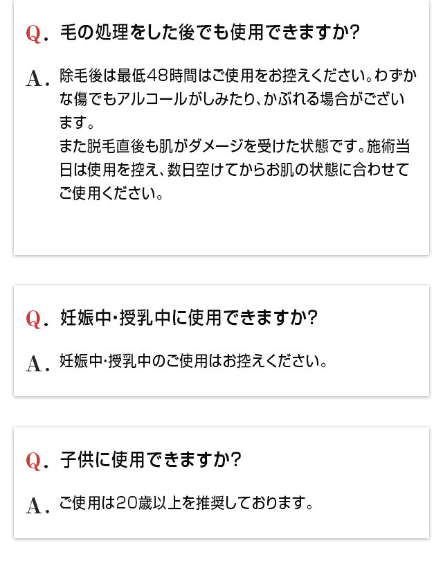 ※熱い温度での入浴後やサウナの直後、シェービングや脱毛後48時間以内、または傷や炎症のある肌(例:湿疹)には使用しないでください。炎症を起こしている肌に使用する場合は、表皮が完全に回復するまで使用をお控えください。