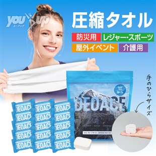 持ち運びしやすい圧縮タイプで、水に濡らすだけでタオル状に広がる便利アイテムです。
