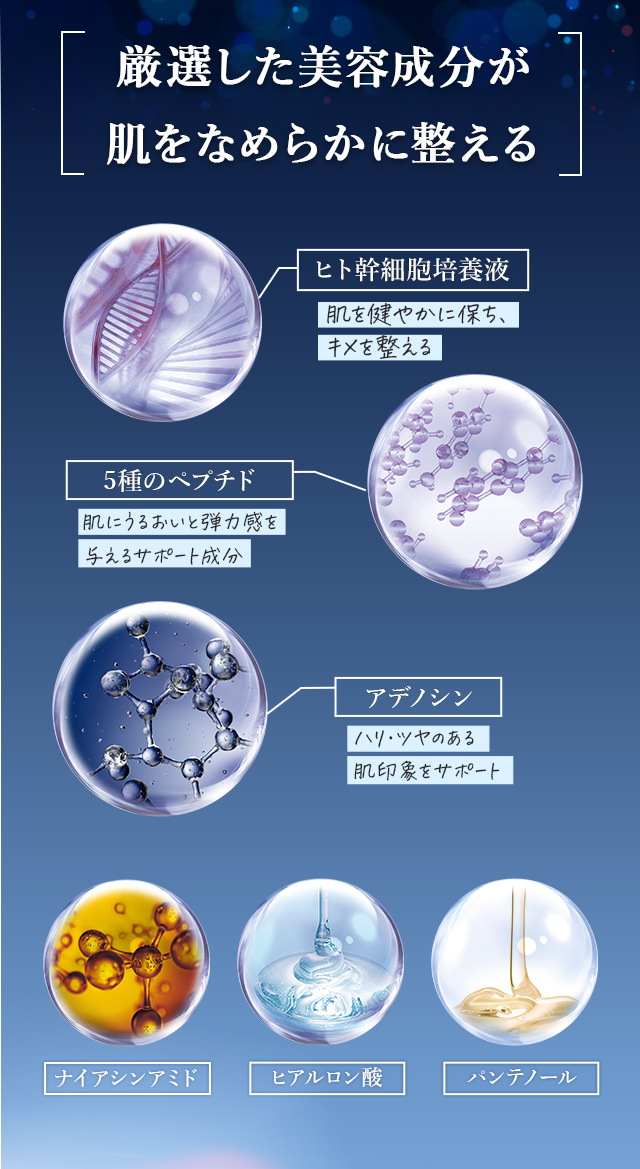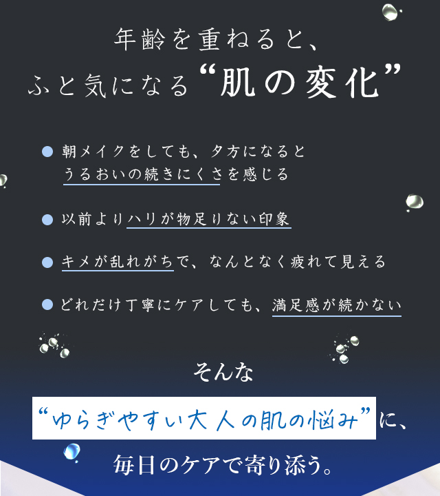 肌を整える成分や保湿成分をバランスよく配合し、乾燥による小じわやハリ不足が気になる肌をしっとりなめらかに導きます。