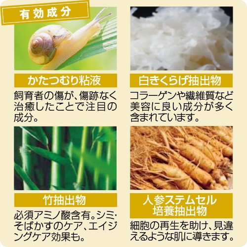 カタツムリ分泌液、ナガイモ根エキス、BG、グリセリン、ナイアシンアミド、フェノキシエタノール、PPG-26ブテス-26、PEG-40水添ヒマシ油、ポリアクリル酸Na、カルボマー 、コメエキス、シロキクラゲエキス、プラセンタエキス、アラントイン、ダイサンチク水、オタネニンジンカルス培養エキス、ペンチレングリコール、アデノシン、ハマメリス水 、1,2-ヘキサンジオール、カプリリルグリコール、香料、EDTA-2Na、マカデミア種子油